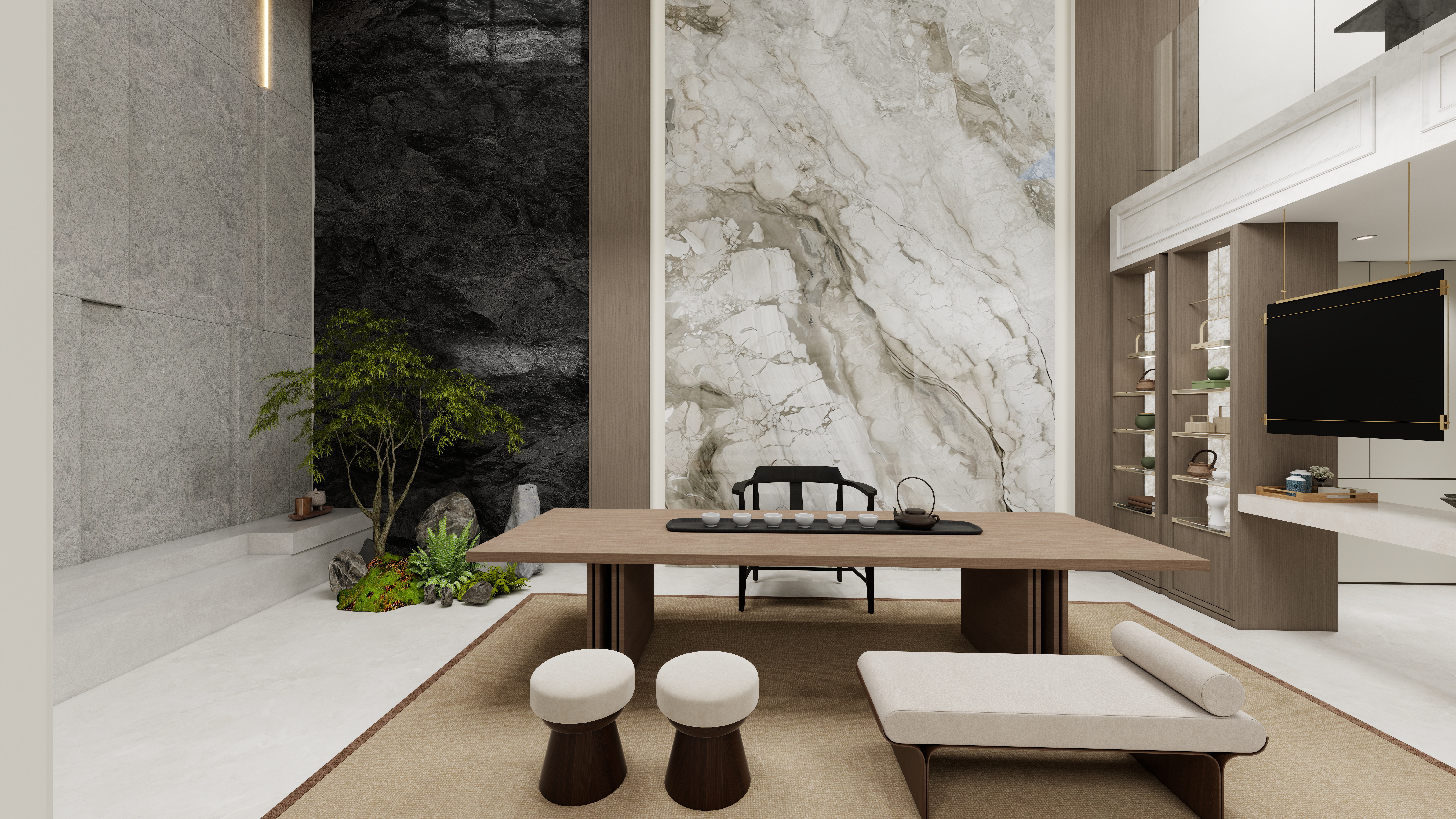 200㎡別墅一層,以頂、墻、門、柜一體化設(shè)計,演繹新中式通透奢華??臻g功能明晰,動線流暢,待客落落大方,處處流露高級品味。超寬敞大客廳頂部采用博格大板與磁吸燈,簡潔有力。錯層蜂窩大板吊頂拉伸空間縱深感,配合多元化的電視與沙發(fā)背景墻,盡顯大氣格局。無論宴請還是家庭聚餐,身處其中,怡然自洽。圓桌會客廳背景墻內(nèi)嵌圓形3D打印畫,結(jié)合發(fā)光造型,成為視覺焦點,圍合出中式雅聚的儀式感。清雅茶室9A木健康墻板背景懸掛山水畫,木質(zhì)溫潤與畫意空靈相映,營造出一方靜心品茗的禪意角落。廚房三面圍合式布局,高效實用。鋁蜂窩大板吊頂防潮耐污,搭配上下定制柜,收納強大,視覺統(tǒng)一。休息留客臥室白棕相間的床頭背景溫馨沉穩(wěn),一門到頂?shù)亩ㄖ埔鹿窈喖s利落,功能與美學(xué)兼具。頂層、墻面、門與柜體的協(xié)奏,在這一方空間里收放自如,成就了新中式別墅的奢華氣度與居家溫度。more +品牌介紹